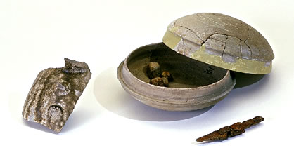 1号墳石室から出土した遺物(須恵器提瓶・蓋杯と鉄刀子) |