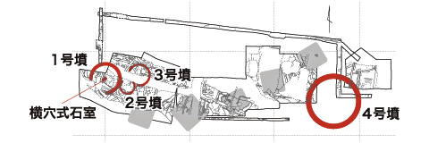 | 古墳時代後期に帰属する4基の円墳を発掘調査によってはじめて確認した。円墳はすべて墳丘盛土が遺存せず、それぞれの円墳の周溝と、1基においてのみ遺存していた横穴式石室を検出したにすぎない。築造時期は古墳の埋葬施設や周溝から出土した遺物から6世紀後葉を中心とするものと推測する。 | ||||||||