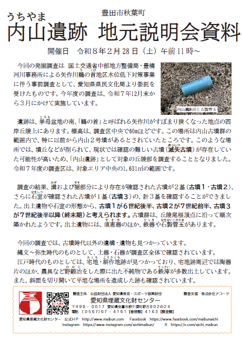 愛知県埋蔵文化財センターでは、令和8年1月から豊田市秋葉町の内山遺跡で発掘調査を進めております。