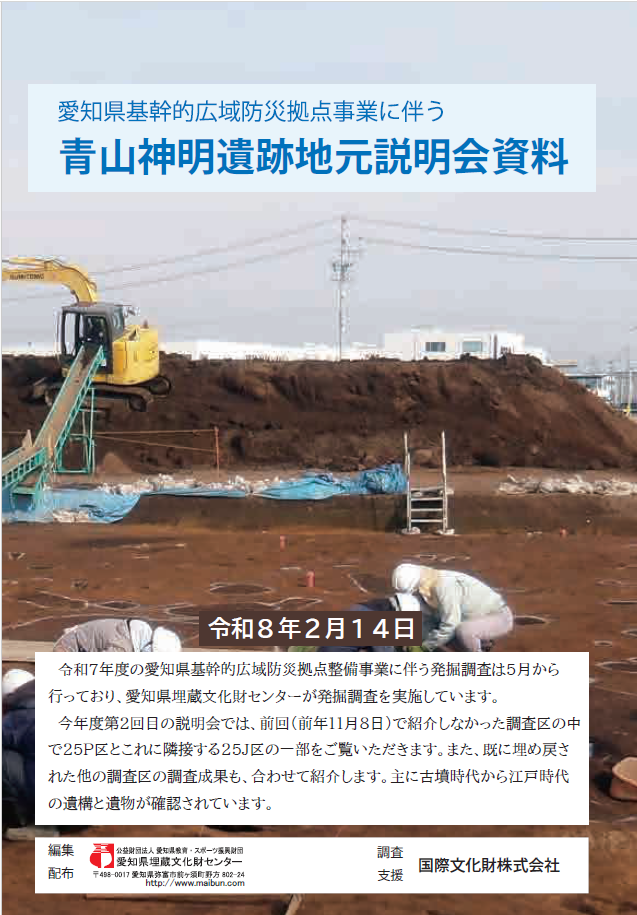 愛知県埋蔵文化財センターでは、愛知県基幹的広域防災拠点整備事業に伴い、発掘調査を行っております。調査の結果、古墳時代から江戸時代にかけての遺構、遺物が確認されています。これらの調査成果についての地元説明会を発掘調査現場にて開催いたします。