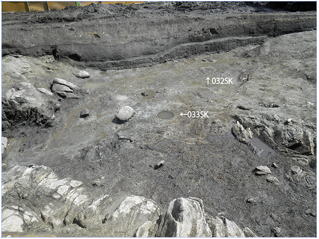 ドングリピットは川の最下層でみつかりました。川の堆積層は腐植物を多く含んだ黒色シルトで、中世以後に溜まったものです。写真の奥、右のドングリピットが032SK、写真手前、左のドングリピットが033SK です。