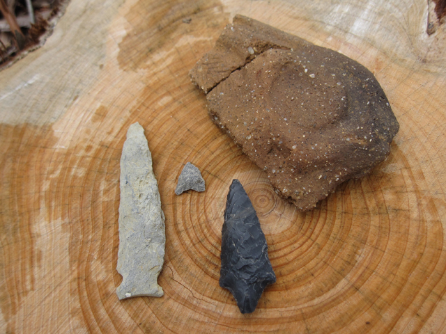 写真4は、縄文土器と石器です。石器は、右から有舌(有茎)尖頭器(ゆうぜつ(ゆうけい)せんとうき)、石鏃(せきぞく)、石匙(いしさじ)です。